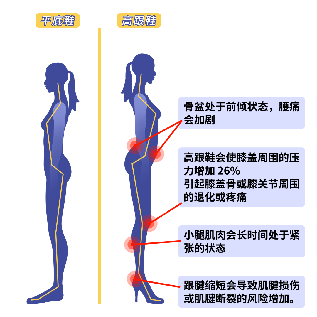 每个女孩小时候都有个梦:拥有一双美美的高跟鞋。 高跟鞋仿佛是「变美」的一条捷径:更修长的双腿比例,更纤细的小腿,穿上高跟鞋的女人们,也像上了发条,臀部自然收缩,胸部前挺,呈现出 S 型曲线。 高跟鞋被赋予了太多美好的词汇:更高、更时尚、更性感、更专业。高跟鞋似乎也成了女性的代名词。 但是,就是这个风靡全球的变美利器,却一直在伤害着女性。 只要穿上高跟鞋 对脚的伤害就已经开始了 姑娘们,还记得第一次穿上高跟鞋的感觉吗?被挤压的脚趾、无法控制颤抖的双腿,每一步都走得异常艰难。 穿上高跟鞋后的脚,出现红肿、脚后跟磨破都是再常见不过的事了。于是,很多女孩会说「没关系,一定是自己还没有适应,习惯习惯就好」。 但残酷是真相是,无论你穿多久的高跟鞋,买到多合脚的高跟鞋,这样的伤害都不会减少。因为高跟鞋已经破坏了人类进化得来的走路的生理构造。 高跟鞋最常见的体验是,穿上没一会就觉得前脚掌痛、后脚跟痛。 不痛才怪。 我们的双脚要承担全身的重量和压力,但生物的进化让这些压力相对均衡地分散在整个脚掌,跑跳走站……都可以相对轻松点。但穿上高跟鞋的瞬间,原有的压力分配就失衡了。 有研究者做了个实验,一双 5 厘米高的高跟鞋,前脚掌骨骼承受的压力是穿平底鞋的 1.6 倍,脚后跟承载的压力更是达到了原来的 4.3 倍。 「一天下来,脚趾头都不是自己了。」 下面这张实验研究图,更清晰地展示了脚趾的变化:和平底鞋相比, 5 厘米的高跟鞋静止站立,脚踝处和接近脚趾处的压力陡然升高,大脚趾附近的压力升高了 17 倍。破皮、红肿、水泡——这就是最直接的伤害。 如果穿得不是普通的高跟鞋,而是一双鱼嘴高跟鞋或者尖头高跟鞋,脚趾甚至会变成这样: 一项有趣的调查还发现,20% 的女性在穿上高跟鞋 10 分钟之后就出现了疼痛感,平均感到疼痛的时间是 1 小时 6 分钟。 脚承受了它本不应该承受的压力,为了「顺应」这样变化,很多人的脚悄悄发生了变化,甚至变得畸形——拇外翻、脚底老茧、甲沟炎、拇囊炎,第一跖趾关节炎都和它有关。 拿最常见的拇外翻来说,在穿高跟鞋站立时,大脚趾过度伸展,第一跖骨头下压力的增加将迫使跖骨向内侧背侧移动。而高跟鞋鞋头的尖而窄,会使踇趾进一步向外偏斜。从而逐步造成拇外翻畸形。 即使再光鲜亮丽的明星都逃不过高跟鞋带来的伤害。 ➡️左滑查看女明星出逃的脚趾图 有研究发现,4 年以上的高跟鞋史,比 4 年以下高跟鞋史的人群拇外翻发生率高 5.2 倍,高跟鞋高于 5~6 公分的会有显著差异,而且越是好看的尖头鞋,越容易造成这样的损害。 拇外翻一旦形成,几乎无法逆转。按摩也好、矫形器也好,都不能将歪斜的脚趾纠正,严重的拇外翻,需要手术治疗才能缓解。 高跟鞋迫害的不只是脚 伤膝盖伤腰还会骨盆前倾 别惊讶,一些人的腰痛也和高跟鞋有关。 想象中穿高跟鞋走路的样子: 而真实生活中很多人穿高跟鞋走路的样子是这样的: 通常我们走路,脚掌、脚踝、膝盖、胯部、腰部各司其职会形成一个省力的模式。 然而穿上高跟鞋走路,小腿处于紧张的状态,踝关节活动的力矩减小,同时需要膝关节通过更大的活动来弥补。 而膝关节过度屈曲也导致骨盆前倾。同时增加腰部肌肉发力以维持异常的姿势,显著增加不适和疲劳感,尤其是长时间穿着。 久而久之,腰疼、小腿疼、膝盖疼都会找上门。 穿高跟鞋走路时崴脚的风险大大增高,医院因为穿高跟鞋崴脚而就诊的人不在少数。 女性需要的是高跟鞋自由 明明每次穿都会痛,明明没有那么舒服,为什么还要选择高跟鞋?减少高跟鞋伤害的最好的方式就是—— 不穿! 爱美之心人皆有之,但女性穿高跟鞋的这份执着里,可能不只是对「美」的追求。 社会对女性的潜意识形象里,就把高跟鞋和女性画上了等号,就好像厕所门口的高跟鞋标识。 从小我们听的童话故事里,公主一定会有一双好看的高跟鞋,甚至要靠它来找到爱情。 电视剧、时尚杂志里,到处都是蹬着高跟鞋健步如飞的女人。高跟鞋和性感、优雅、知性做了深度绑定。 「每个女孩的鞋柜里,都该有一双高跟鞋」 「女人,要能驾驭得了高跟鞋」 甚至女性的职场规训里,也逃不开对高跟鞋的要求: 「穿上高跟鞋吧,这才是职业女性的样子」 「正式场合,一定要穿高跟鞋」 但是……为什么女性的魅力和能力,要被一双鞋代表?而且要用健康和痛苦作为代价? 随着越来越多的女性开始打破性别的枷锁,关注自己的感受,关注自己的健康,对于高跟鞋的评价,渐渐有了不一样的声音。 2019 年,日本女性石川由美发起了一场「反高跟鞋」运动,呼吁日本社会关注职场对女性不合理的服装要求。 日本的许多企业都要求女性员工穿 5 到 7 厘米(1.9 到 2.75 英寸)的高跟鞋;而研究发现,鞋跟高于 4~5 公分,对于身体的伤害就会大大增加。 希望更多的人能意识到,高跟鞋带来的「美」,是有健康代价的。 希望更多的人能意识到,高跟鞋只是一种选择,它造成的痛苦和折磨,并不是每个女性都应该学会适应和忍受的技能。 我们反对「高跟鞋绑架」,无论是在职场,还是在生活中。 姑娘们,你认真的样子很美,无论穿着高跟鞋,还是运动鞋。 -小贴士- 到底怎样的鞋子才是好鞋子,其实并没有一个标准答案,每个人的脚都不一样,但可以大概这么判断:如果一双鞋子你穿了一整天都没啥不舒服,那就