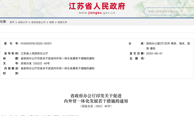 江苏出台促进内外贸一体化发展“11条”,推进一般消费品等“同线同标同质”
