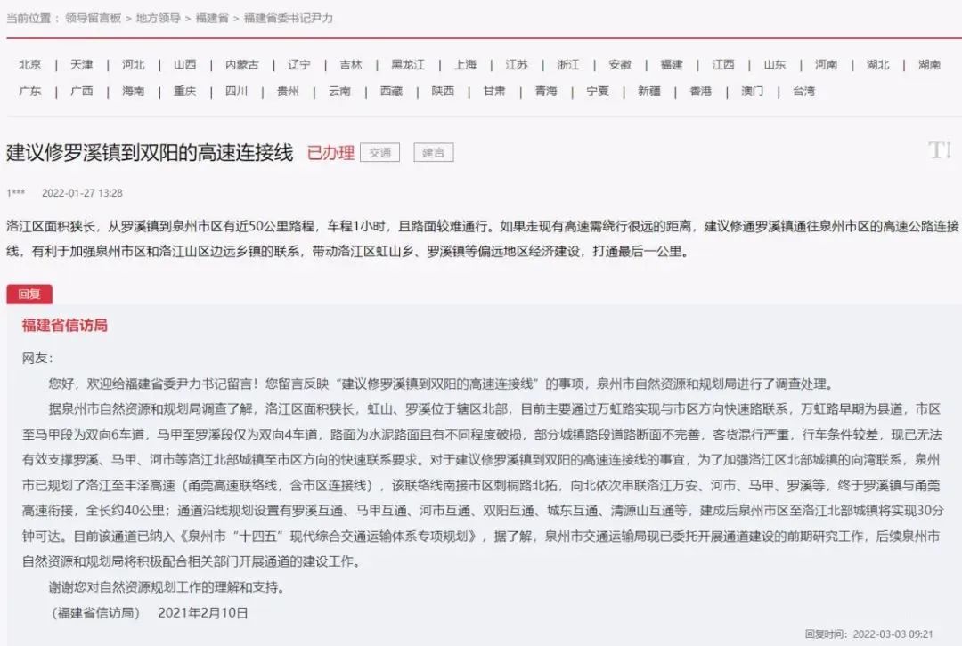 泉州市自然资源和规划局在今年3月对此答复: 对于建议修罗溪镇到双阳的高速连接线事宜,为加强洛江北部城镇的向湾联系,泉州市已规划了洛江至丰泽高速(甬莞高速联络线),该联络线南接市区刺桐路北拓,向北依次串联洛江万安、河市、马甲、罗溪等,终于罗溪镇与甬莞高速衔接,全长约40公里。 而此次洛江至丰泽高速(甬莞高速联络线)的招标建设,不仅缩短了洛江通往市区的距离,也缩短了洛江北部城镇的进城时间,为后续洛江的北部片区开发提供必要条件。 |