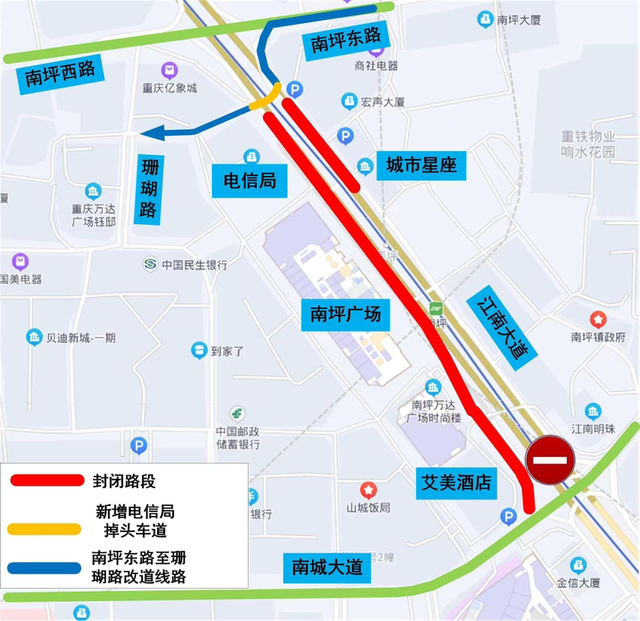 出行示意图。警方供图 华龙网-新重庆客户端讯(记者 余志斌)记者从南岸警方获悉,为进一步规范南岸区南坪广场的交通秩序,提升南坪商圈城市环境,自2022年6月21日0时起,南坪广场交通组织将进行调整。相关信息如下: 一、南坪广场艾美酒店至电信局路段(单向)禁止车辆通行(进出艾美酒店不受影响),过往车辆改道南坪商圈环道通行; 二、新增电信局路段掉头车道,该掉头车道至南福数码城路段(单向)禁止车辆通行(进出南福数码城车库不受影响)。由南坪东路至珊瑚路车辆改道新增的电信局掉头车道至珊瑚路。 请广大驾驶员提前谋划出行线路,注意交通组织调整后相关交通标志、标线设置,避免产生违反禁令标志等交通违法行为,因交通组织调整给市民出行带来的不便,敬请谅解支持。 |