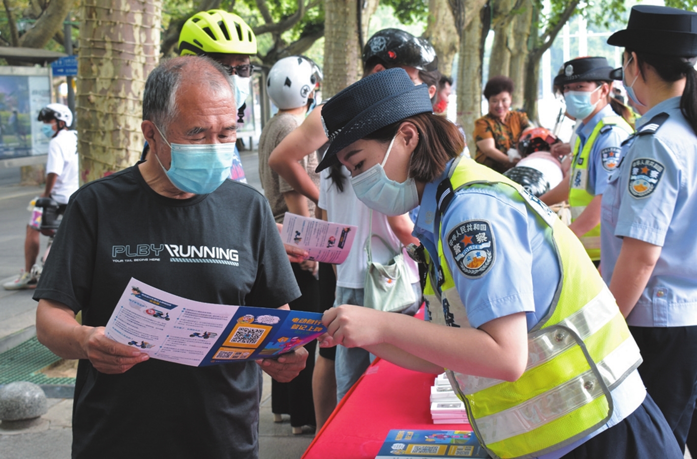 6月16日,市公安局交巡警支队在邯郸市美术馆南侧开展“安全生产月”暨“一盔一带”主题宣传活动,在现场的丛台一大队宣传民警向群众进行交通安全宣传教育。 艾严强苗文金摄 |