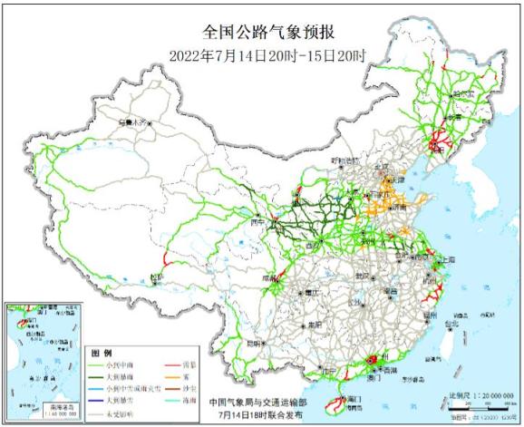 出行气象7月14日20时至15日20时,青海东部、甘肃中部和东部、宁夏中南部、陕西中北部、山西西部、安徽北部、江苏西部等地部分地区有大到暴雨,其中,陕西北部、山西西部等地局地有大暴雨。河北西南部、辽宁中北部、吉林中部、黑龙江北部、江苏东南部、安徽北部、浙江东南部和北部、广东中部和西南部、海南岛中部和北部、四川中部、甘肃中部、宁夏北部、西藏东北部等地局地有雷暴。另外,天津中南部、河北东部和南部、山西东南部、山东北部、江苏北部、河南中部等地局地有雾。