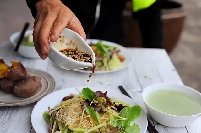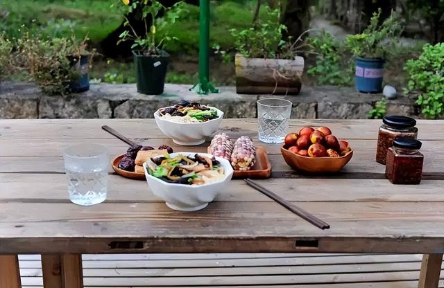 大自然的味道源源不断地被送进小花生的厨房,每一道菜都被摆在古朴的木桌上,远处是绿林流水作背景。