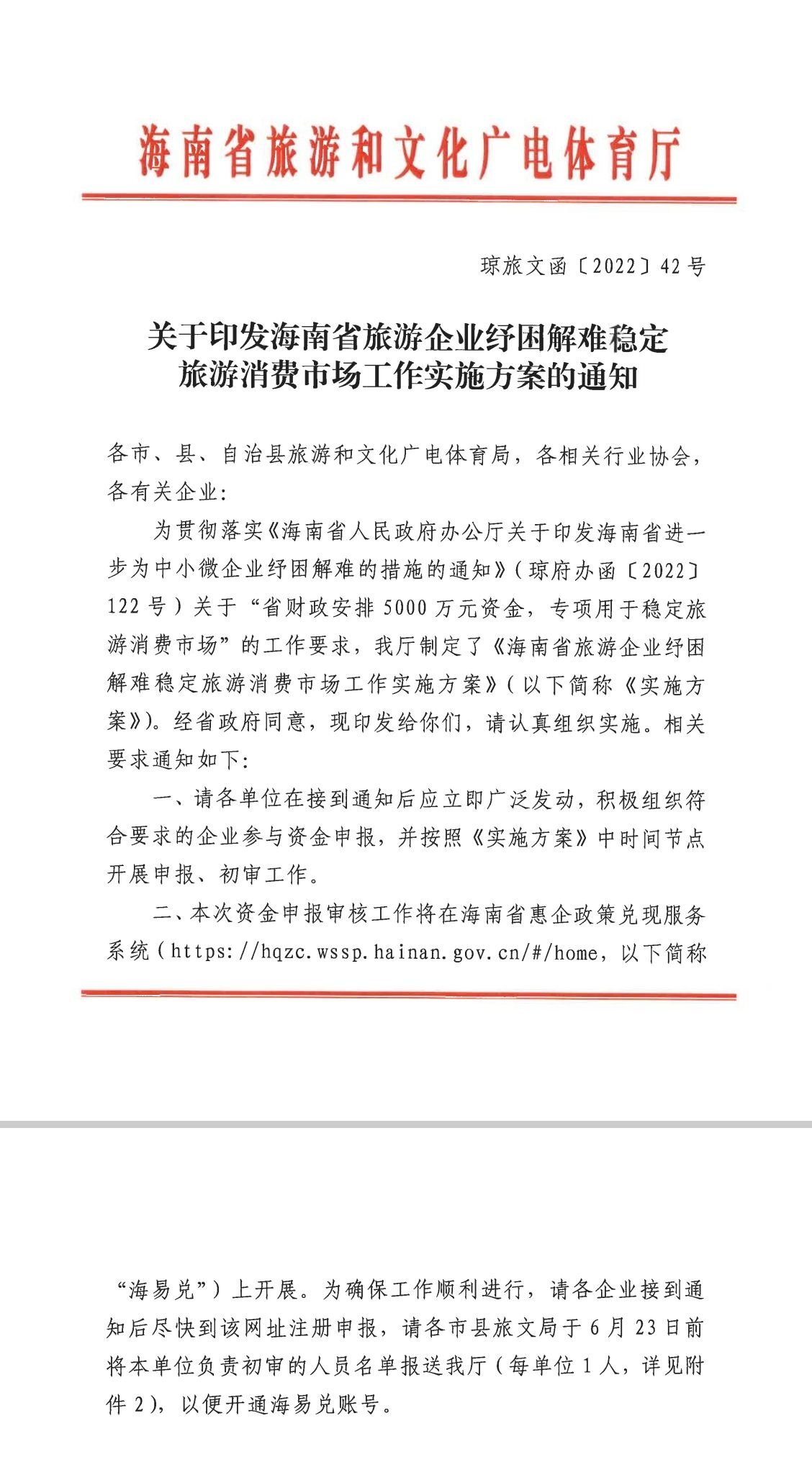 商报全媒体讯(椰网/海拔手机端记者 张艺 通讯员 李艺娜)6月22日,国际旅游岛商报记者从海南省旅文厅获悉,为充分用好用足专项资金,支持海南省重点旅游企业纾困解难,省旅文厅专门制定了《海南省旅游企业纾困解难稳定旅游消费市场工作实施方案》(以下简称《方案》),将对我省受疫情影响较为严重的A级景区、椰级乡村旅游点、旅行社、星级饭店、乡村民宿等旅游企业给予纾困补助,促进旅游消费市场有效复苏。省财政将安排5000万元资金,专项用于稳定旅游消费市场。 细化扶持方式,5类旅游企业可申报 据了解,海南省将细化扶持方式,对符合条件的A级景区、椰级乡村旅游点、旅行社、星级饭店、乡村民宿等旅游企业,分门别类进行扶持。如A级景区和椰级乡村旅游点将按照企业用工人数以每人1600元的标准发放一次性稳岗纾困补助。其中A级景区每家补助最高不超过180万元,椰级乡村旅游点每家补助最高不超过30万元。 将对接待量前100位的旅行社将给予纾困补助。根据海南省旅游电子行程监管服务平台2021年6月至2022年5月31日以来的接待游客数据,对第1—30名补助15万元,第31—60名补助11万元,第61—100名补助9万元。同时,还将对开拓入境旅游市场业绩突出的旅行社给予纾困补助,对符合相关条件的旅行社给予30万元纾困补助。 星级饭店将依据全国旅游监管服务平台星级饭店管理系统的数据(截至2022年3月31日),以每张床位300元的标准发放一次性补助。同时,还将对注册上线海南省旅馆业管理信息系统的全省金宿、银宿等级乡村民宿给予纾困补助(截至2022年3月31日),其中金宿、银宿分别补助5万元、3万元。 同一申报主体,只能申请并享受一类补助 据了解,申报纾困补助专项资金(以下简称专项资金)的旅游企业,应在海南省内办理注册登记,具有独立法人资格;诚信守法经营、未纳入严重失信主体名单;依法申报缴纳税款,不存在欠税情形、纳税信用级别不为D级或其他严重违反税收法律、行政法规行为。A级景区、椰级乡村旅游点纾困补助专项资金的申报主体须为市场化运营的企业。同一申报主体只能申请并享受一类纾困补助。 资金申报将按照企业申报、市县初审、省级审核、公示拨付四个步骤进行,其中资金的申报审核在海南省惠企政策兑现服务系统(以下简称“海易兑”)上进行操作。符合条件的旅游企业要注册登录“海易兑”平台,并在6月26日前在线提交申报材料。申报单位所在市县旅文局收到资金申报材料后,应及时会同当地有关部门,通过“海易兑”平台对申报材料进行真实性、合规性审查,并在6月30日前提出推荐意见并在线报送省旅文厅。 “各级旅游文化主管部门应切实做好申报审核工作,提高资金使用效益。同时,省旅文厅将会同省财政厅加快专项资金拨付进度,加强财政资金绩效管理与监督检查。”省旅文厅相关负责人提醒,申报企业要对申请材料的真实性、完整性和准确性负责,并承诺所获得奖补资金全部用于生产经营活动。对申报企业违反规定多头申报、套取、骗取财政资金,挪用资金用于理财等套利活动的,将取消财政政策支持,并由省旅文厅追回省级资金,同时将按照有关法律法规追究相关责任。 海南省惠企政策兑现服务系统(海易兑)链接:https://hqzc.wssp.hainan.gov.cn/#/themeTypeDetail?themeTypeId=979020444055408640 咨询电话:65227375 A级景区、椰级乡村旅游点申报咨询电话:65331723 入境游旅行社申报咨询电话:65200561 旅行社、星级饭店、乡村民宿申报咨询电话:65200152 海易兑网站技术咨询电话:60827008