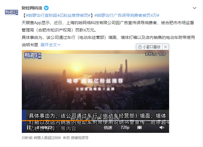 因广告宣传误导消费者,哈啰出行宣称超4亿粉丝推荐被罚