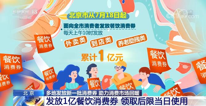 先去北京看看。记者从北京市商务局了解到,北京市从7月18日起,面向全市消费者发放餐饮消费券,每天上午10时发放,有外卖类、到店类、养老助残类三种,累计1亿元。由政府和提供餐饮类服务的平台企业共同出资,超过7万家餐饮商户参与,其中,外卖及到店堂食券设置两种面额,分别为消费满50元减15元和消费满100元减30元。每人在每个平台可领取1个外卖消费券包和1个到店消费券包,单日最多可领取2个券包共4张消费券,单张消费券限领1次,限当日使用,没有使用的消费券于当日23点59分59秒过期失效。