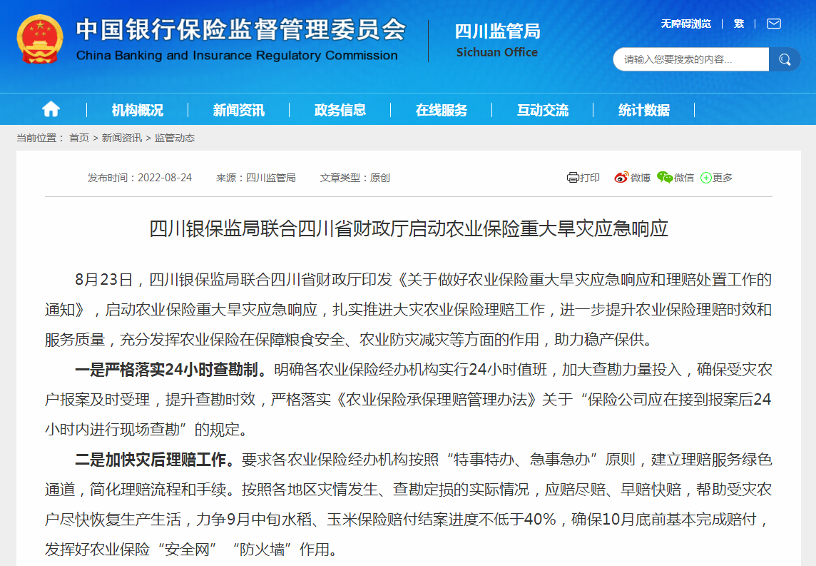 8月23日,四川银保监局联合四川省财政厅印发《关于做好农业保险重大旱灾应急响应和理赔处置工作的通知》,启动农业保险重大旱灾应急响应,进一步提升农业保险理赔时效和服务质量。 红星新闻记者获悉,通知要求各农业保险经办机构实行24小时值班,加大查勘力量,确保保险公司在接到受灾农户报案后24小时内进行现场查勘。为加快灾后理赔,各农业保险经办机构要建立理赔服务绿色通道,简化理赔流程和手续。按照各地区灾情发生、查勘定损的实际情况,应赔尽赔、早赔快赔,力争9月中旬水稻、玉米保险赔付结案进度不低于40%,确保10月底前基本完成赔付。 为防止弄虚作假,通知要求督导各农业保险经办机构加强统计回溯,落实赔款“一卡通”制度。将农业保险经办机构查勘时效、赔付进度、赔付质量有关情况纳入农业保险经营综合考评。同时,督促各农业保险经办机构加大与各级财政、农业农村等有关部门的汇报沟通力度,强化大灾理赔期间的资金保障,确保保费补贴资金及时足额拨付。
