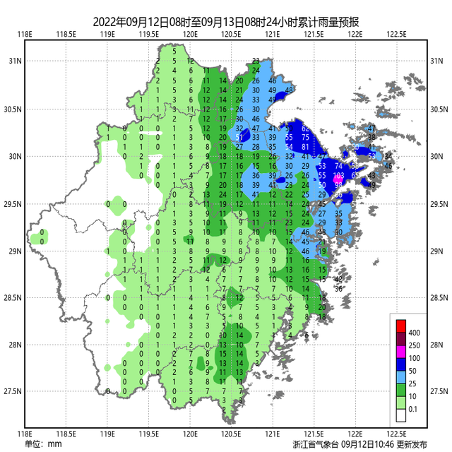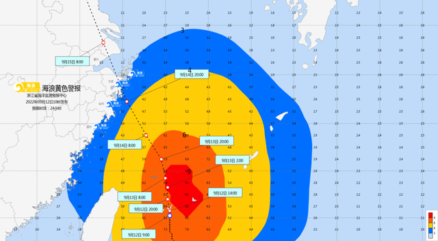 海浪警报图 舟山市: 舟山市防指已于9月11日18时将防台风应急响应提升为Ⅳ级。 宁波市: 根据《宁波市防汛防台抗旱应急预案》,宁波市防指决定于9月12日10时启动防台风Ⅳ级应急响应。 台州市: 根据《台州市防汛防台抗旱应急预案》,台州市防指决定9月12日12时将防台风应急响应调整为Ⅳ级应急响应。 嘉兴市: 9月12日12时,嘉兴市启动防台风Ⅳ级应急响应。 短期天气预报 受第12号台风梅花影响,预计今天:浙江东部地区部分中到大雨,宁波、舟山、嘉兴、绍兴东部、台州北部等地部分暴雨,局部大暴雨;其它地区多云局部有阵雨;沿海海面阵风8~9级。 明天后天:浙中北地区阴有中到大雨,其中宁波、绍兴、舟山、嘉兴、台州北部等地部分暴雨,局部大暴雨;其它地区多云到阴,部分有阵雨。