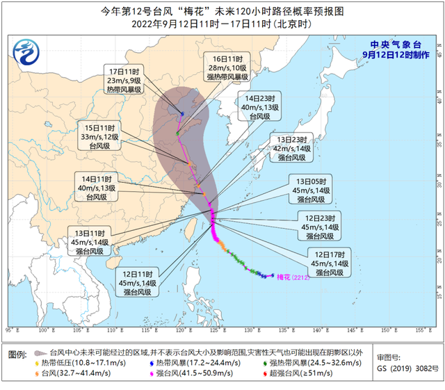 来源:浙江发布 转眼就到了假期最后一天 中秋小长假浙江气温总体舒适 今起台风“梅花”的影响开始显现 部分地区风雨增强 在返程路上的大家 别忘了关注天气和交通的最新消息! 台风最新动态 12日13时,台风“梅花”位于北纬24.6度、东经124.1度,距离浙江省舟山市南偏东方向约630公里。 预计,“梅花”将以每小时5-10公里的速度向北偏西方向移动,强度变化不大,将穿过琉球群岛于12日晚上移入东海南部海面,逐渐向浙江东北部沿海靠近,并可能于14日夜间至15日白天登陆或擦过上述沿海地区。