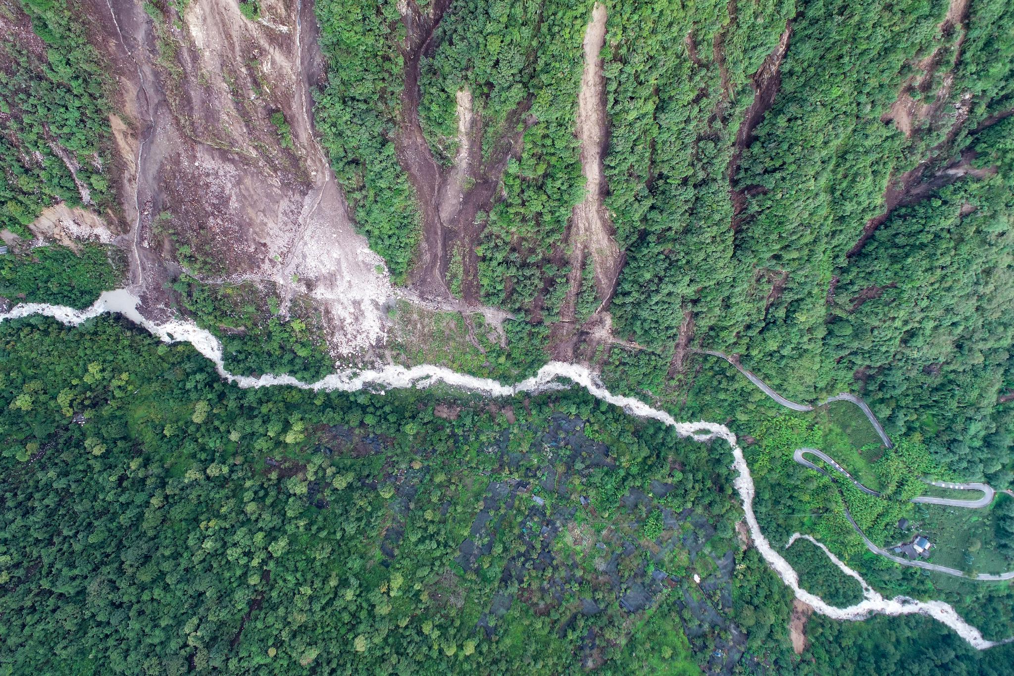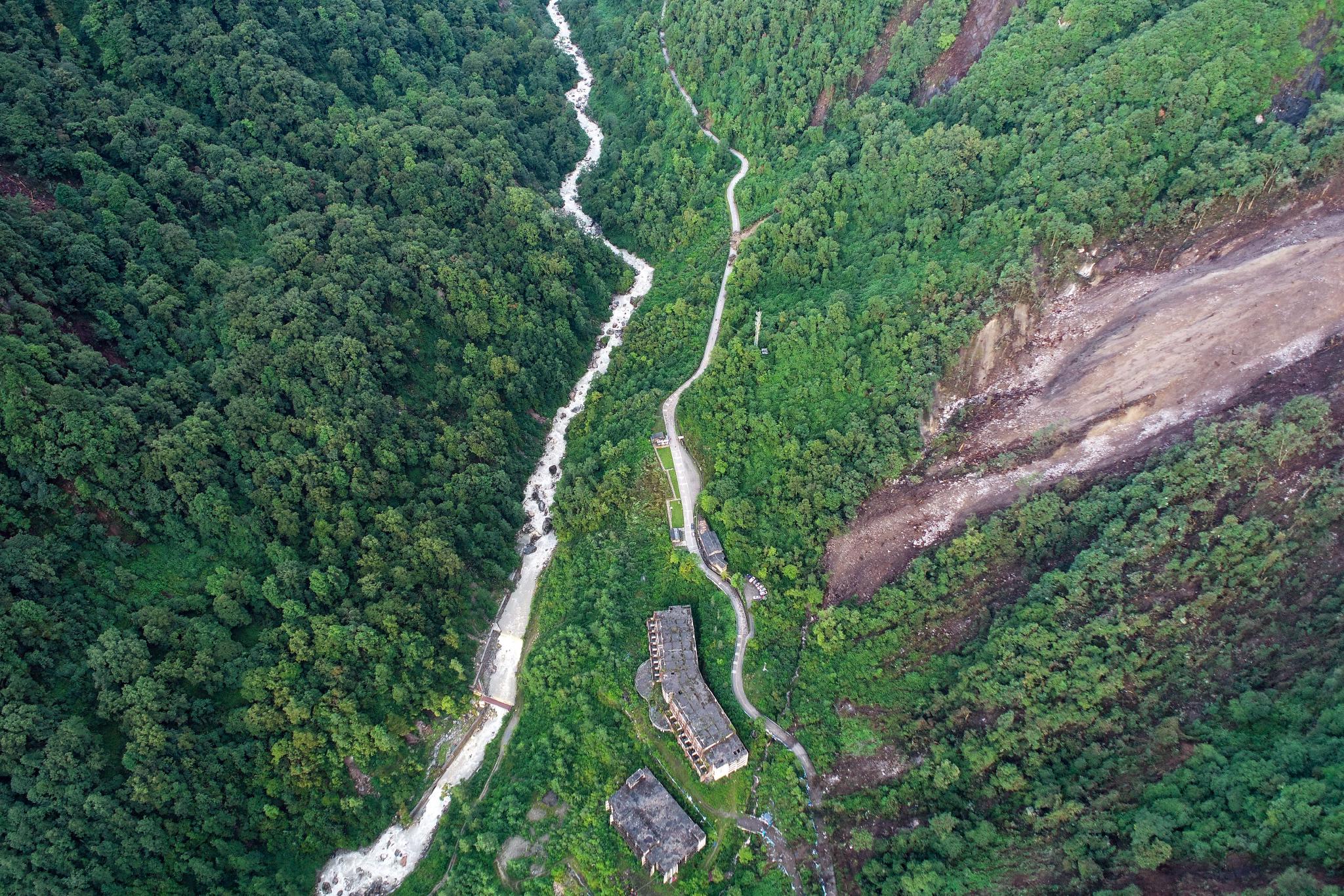 这是9月7日拍摄的海螺沟景区一号营地下游处的崩塌灾害现场(左上部分)(无人机照片)。新华社发(四川省冶勘设计集团有限公司供图)