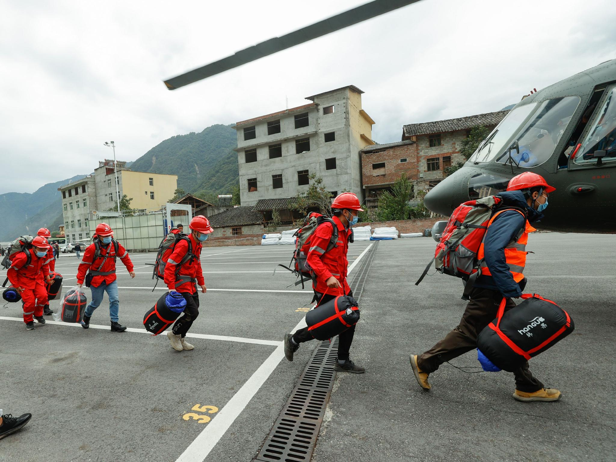 9月7日,在四川省甘孜州泸定县磨西镇,四川省冶勘设计集团有限公司的6名调查队员携带装备搭乘直升机前往海螺沟景区开展地质灾害应急排查工作。 新华社记者 沈伯韩 摄